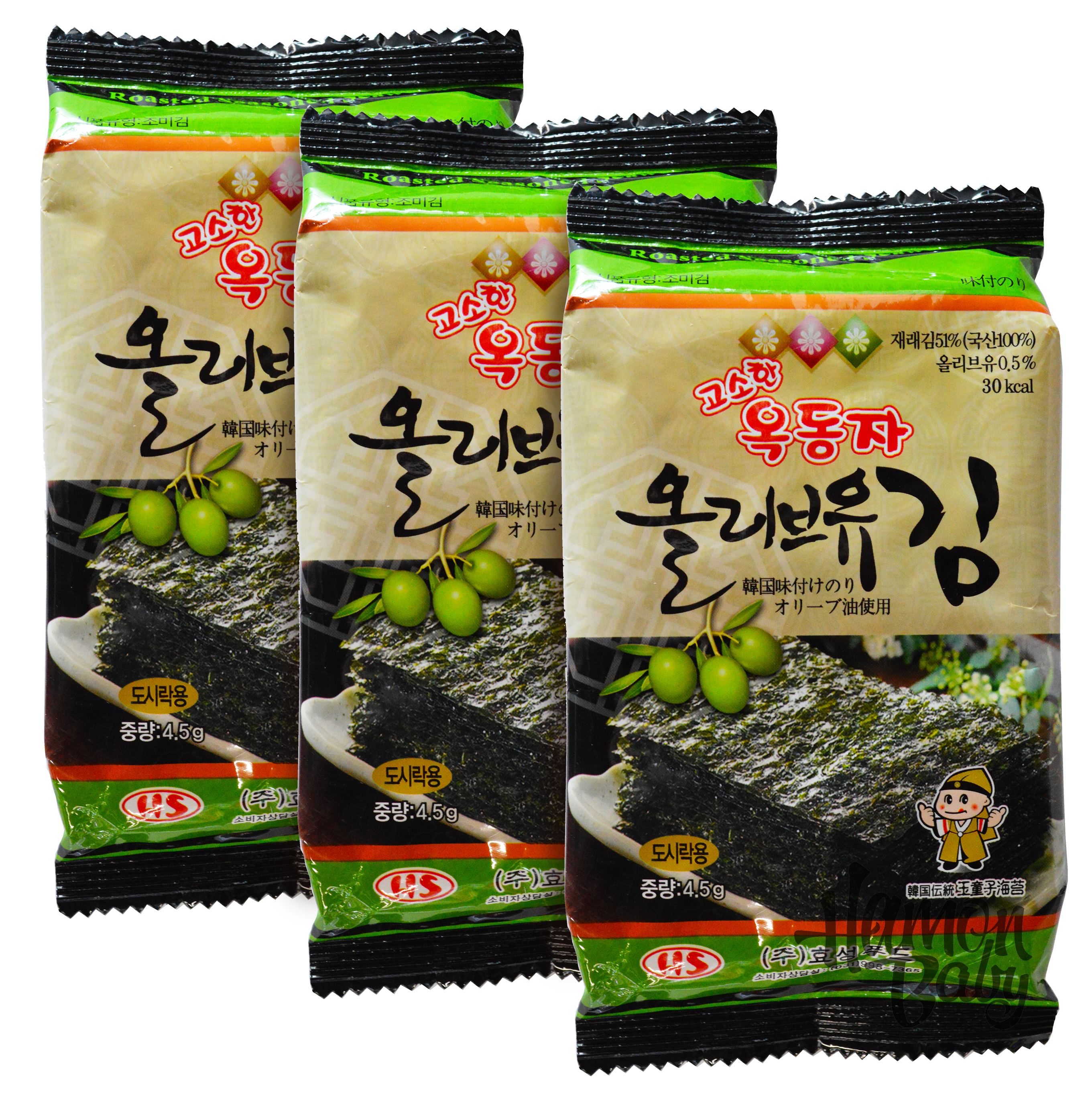 Склад: морські водорості (100% корейські), кукурудзяна олія, оливкова олія, сіль. Харчова цінність на 4,5 г: білки 1,13 г, жири 1,58 г, вуглеводи 1,13 г, натрій 6,25 мг. Енергетична цінність на 4,5 г: 25,5 ккал.