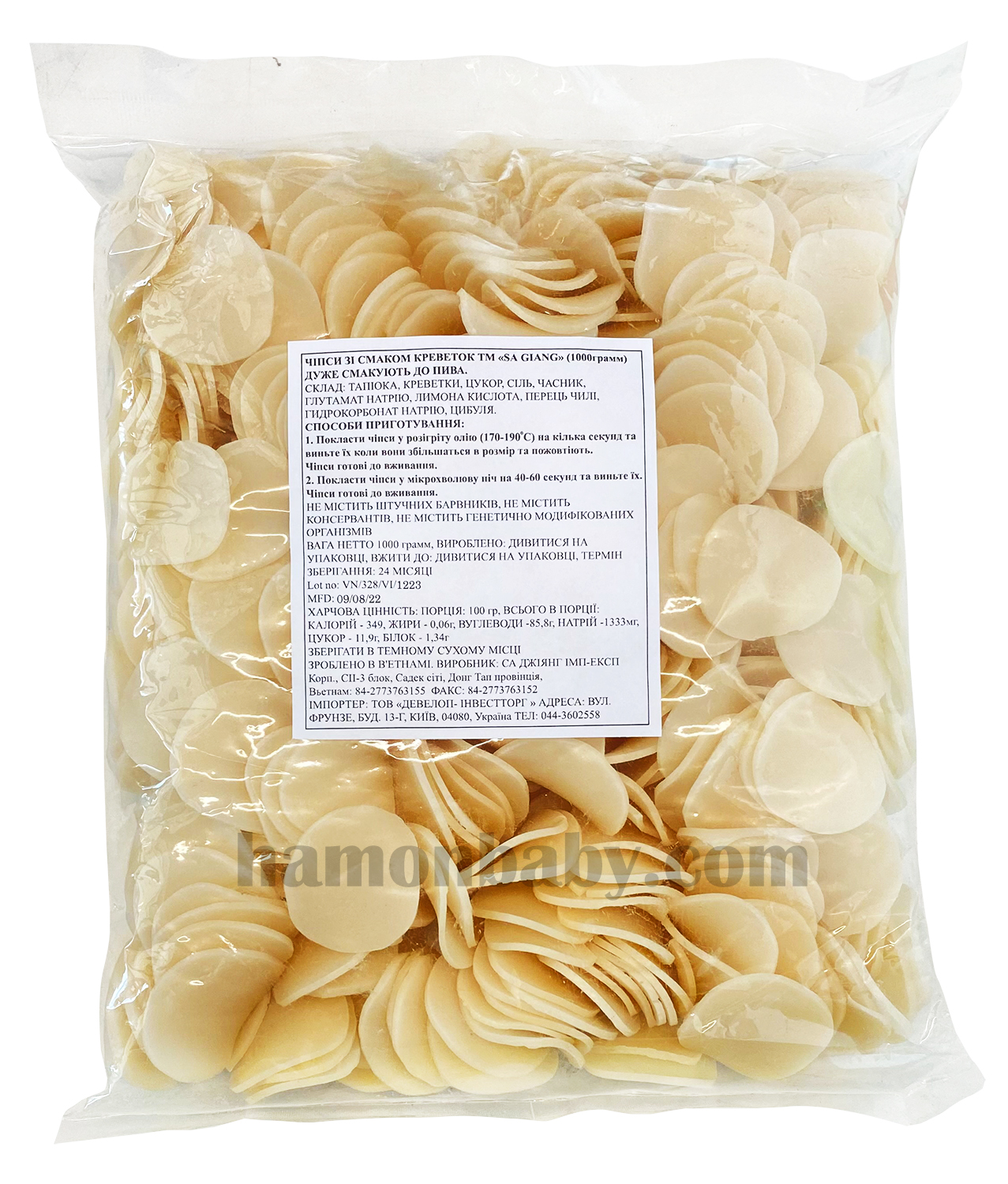 Склад: тапиока, креветки, цукор, сіль, часник, глутамат натрію, лимонна кислота, перець чилі, цибуля, гіброкарбонат натрію.