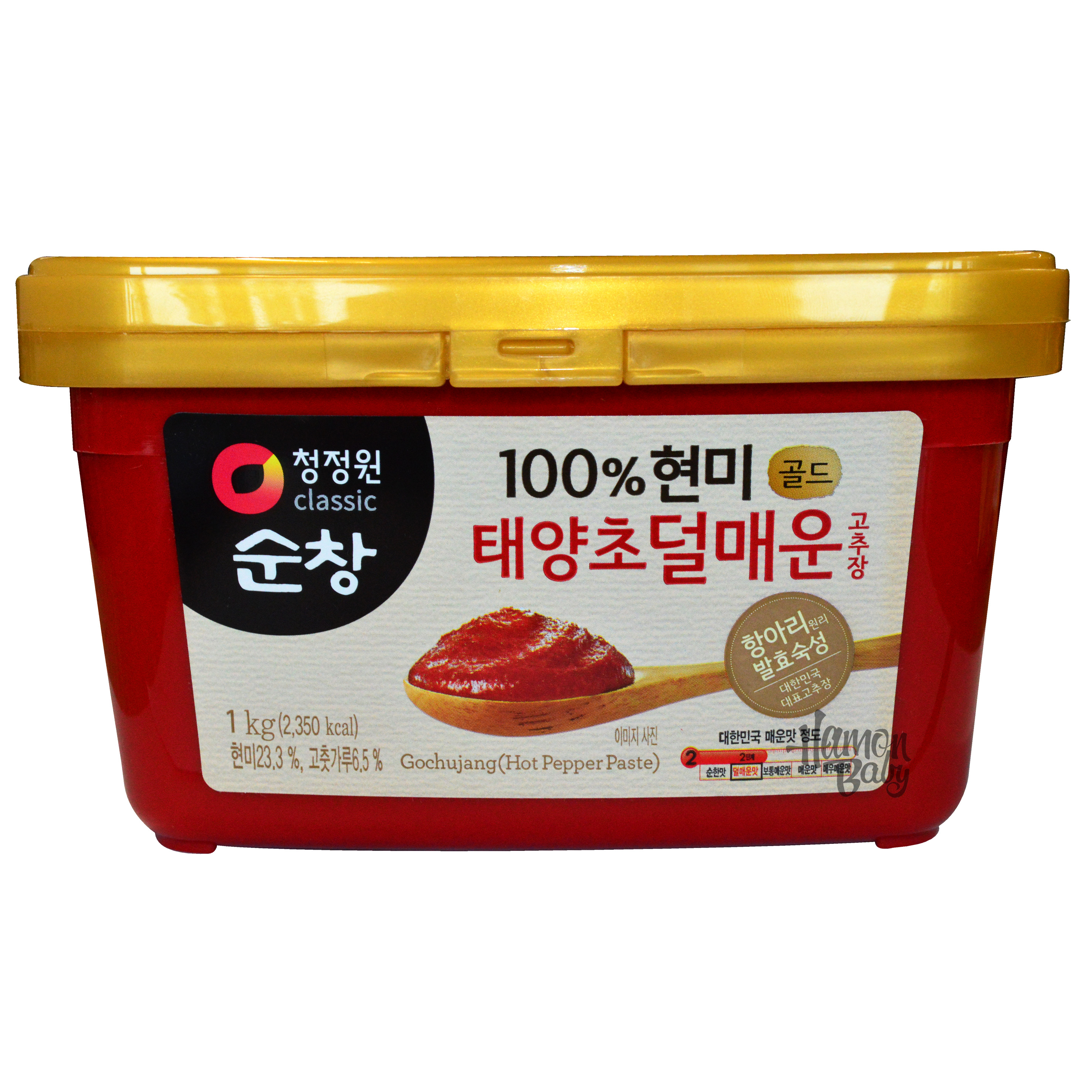 Gochujang - пікантна і гостра корейська паста з чилі, зроблена з червоного перцю чилі, клейкого рису, ферментованих соєвих бобів і солі.