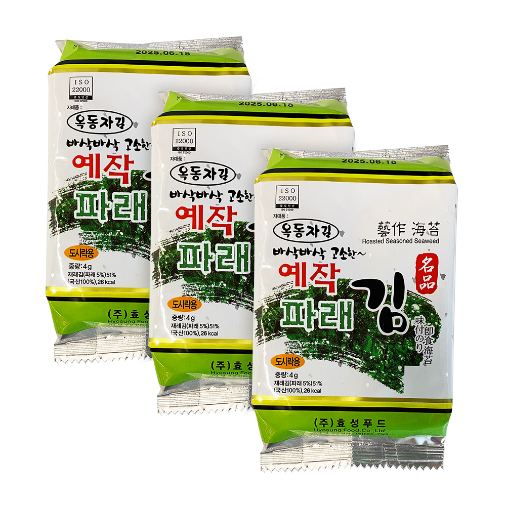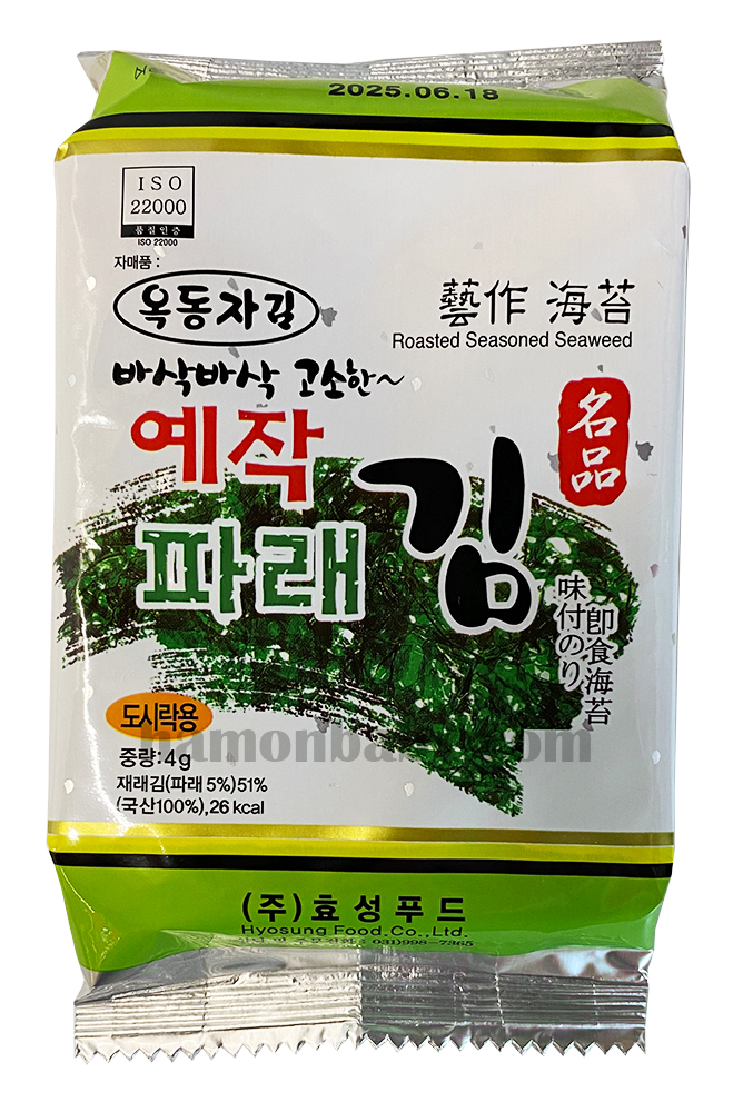 Склад: морські водорості (Green Laver 5% )51%, кукурудзяна олія 43%, кунжутна олія 4%, сіль 2%. Харчова цінність 4 г: жир 2 г, вуглеводи 2 г, білок 1 г, натрій 66 мг. Енергетична цінність: 4 г: 26 ккал.