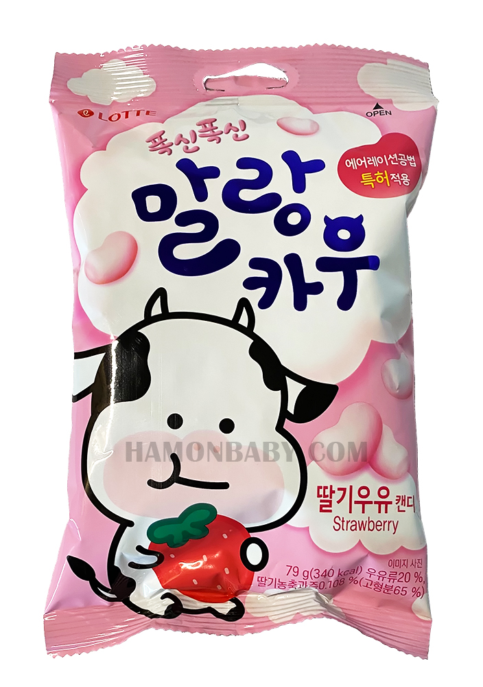 Склад: крохмальний сироп, оброблене згущене молоко, цукор, оброблений жир (пальмова олія, d-токоферол), молочні вершки, сироватка, розчин D-сорбіту 2,7%, желатин, оброблені бобові продукти, синтетичний ароматизатор (полуниця, молоко, вершки), змішаний препарат (крохмаль, цукор), емульгатор, лимонна кислота, пулулан, полуничний концентрований сік 0,108%, пігмент гарденію червоний, вітамін Е, змішане харчове масло.