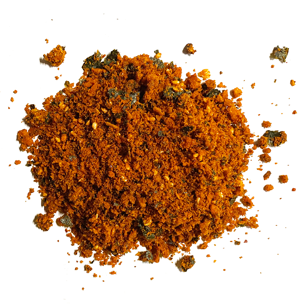 Склад: чіпси смаженої цибулі, сушені креветки, перець кочугару, водорості норі, сироп кукурудзяний, насіння кунжуту, цукрова пудра, приправа смаково-ароматнична з тунцем, кунжутна олія.