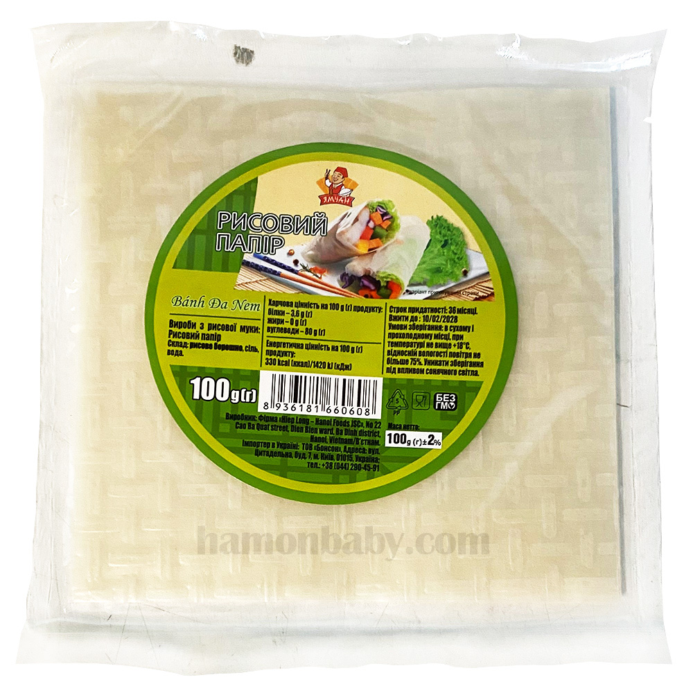 Склад: рисове борошно, вода, сіль. Харчова цінність 100 г: жир 0 г, вуглеводи 80 г, білок 3,6 г. Енергетична цінність на 100 г: 330 ккал.