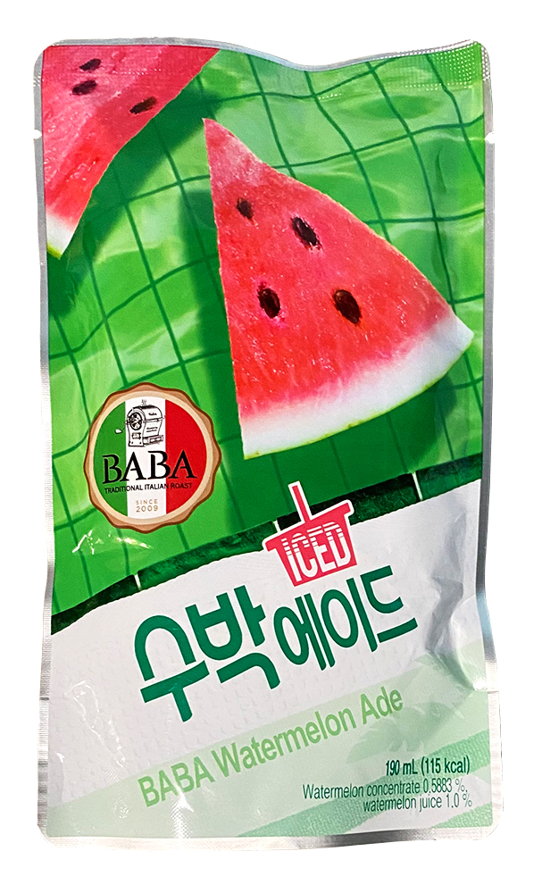 Склад: вода, цукор, кавуновий сік, концентрат кавуна, декстрин, ароматизатор, підсолоджувач Е955, антиоксидант Е300, барвник (Е102, Е129).