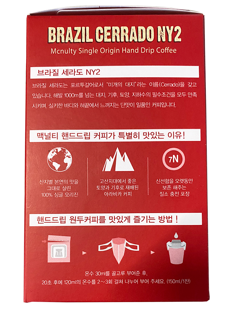 Склад: кава мелена 100% бразильська. Харчова (поживна) цінність 8 г: жир 0 г, вуглеводи 0 г, білок 0 г, натрій 0 мг. Енергетична цінність 8 г: 5 ккал.