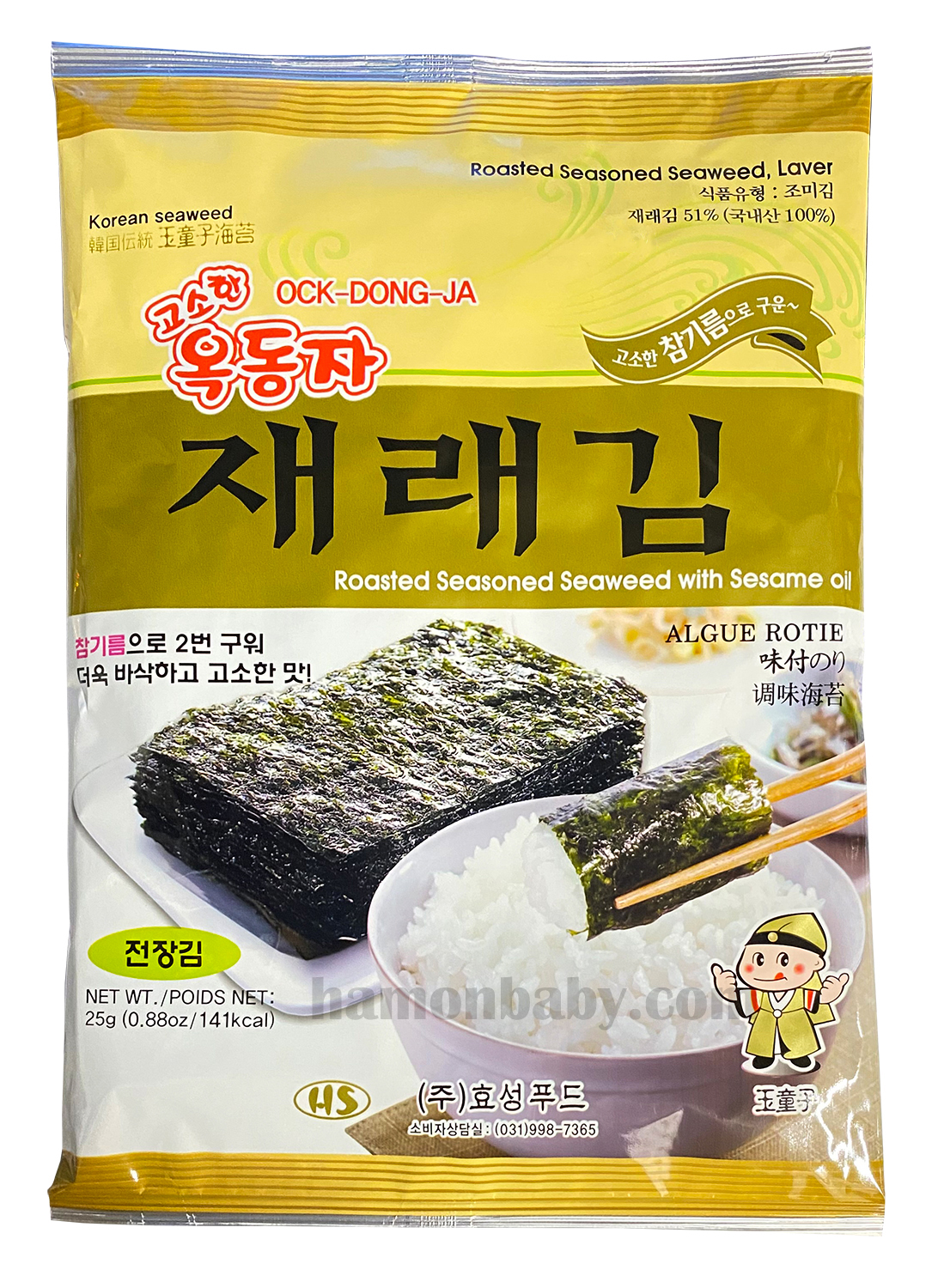 Склад: кукурудзяна олія 43%, морські водорості Laver 51%, сіль 2%, кунжутна олія 4%. Харчова цінність порція 4 г: білки 1 г, жири 2 г, вуглеводи 2 г, натрій 90 мг. Енергетична цінність на 25 г: 141 ккал.